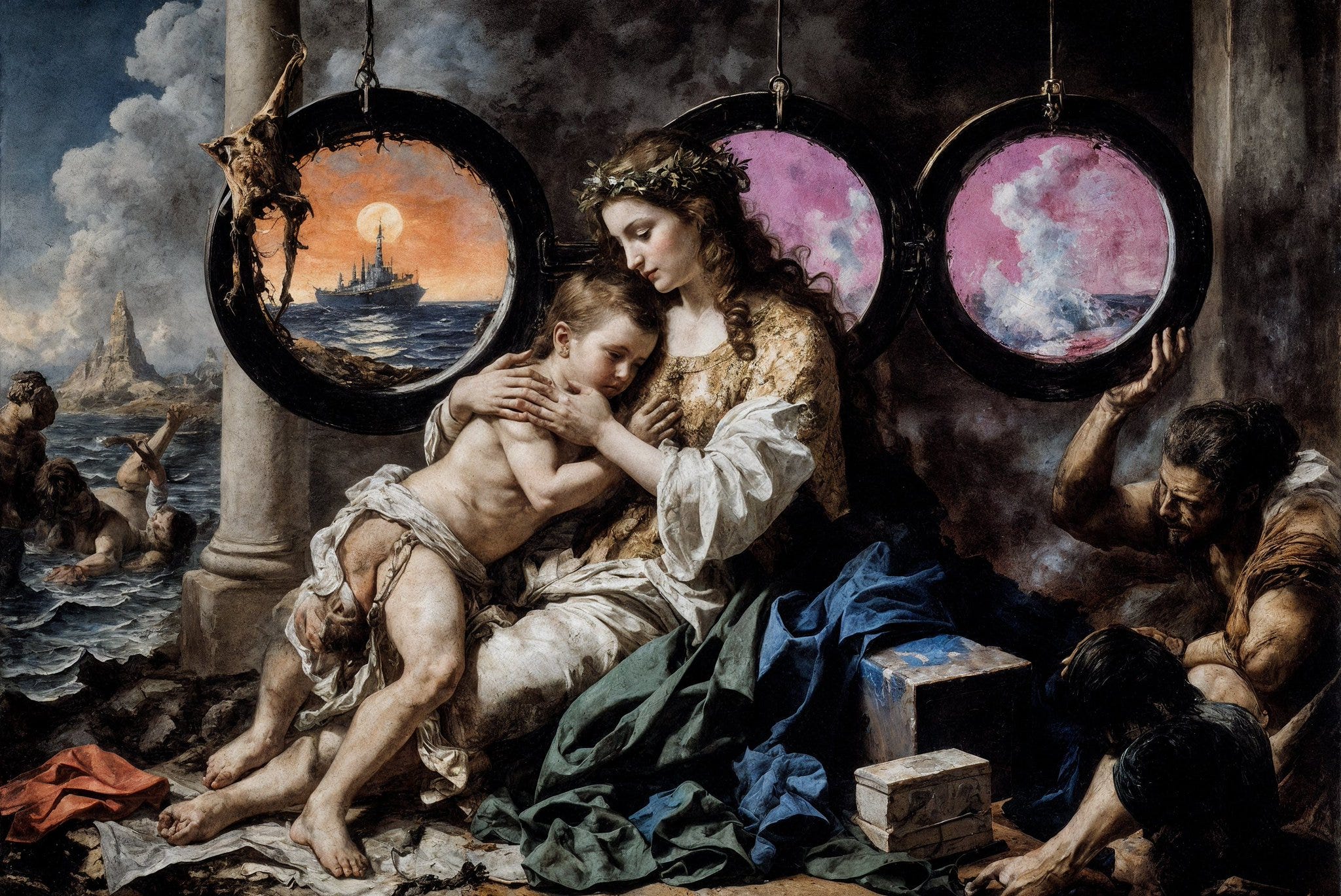 At a time when artificial intelligence advances a visual culture of perfected bodies and seamless precision, Artifishal’s Not Saints, the fifth of his art collections inscribed on Bitcoin, marks a decisive divergence. Conceived as a creation myth articulated across seven books and 133 works, it draws on the visual grammars of classical painting, sacred iconography, and epic cinema, only to quietly dismantle their assurances. What defines Artifishal’s inimitable style is his instinct for contradiction: figures hover between coherence and collapse, ancient and futuristic, remembered and imagined. He allows these tensions to structure the emotional architecture of the work. As a result, distortions, hesitations, and unstable anatomies—often dismissed as technical errors—become central, presenting imperfection not as something to repair but as the essential condition through which the contemporary image becomes truly human.