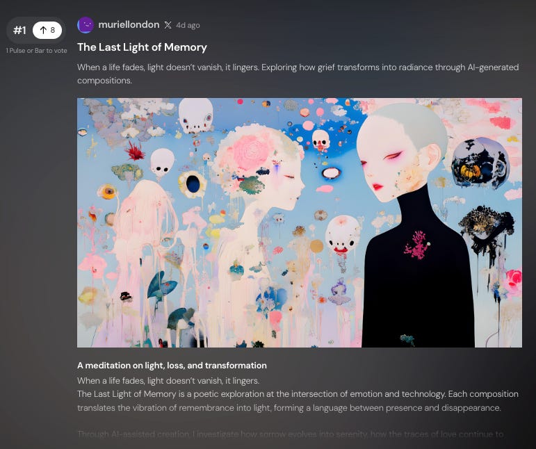Muriell Lherm presents The Last Light of Memory, a striking new collection exploring how grief transforms into radiance through AI-generated compositions.