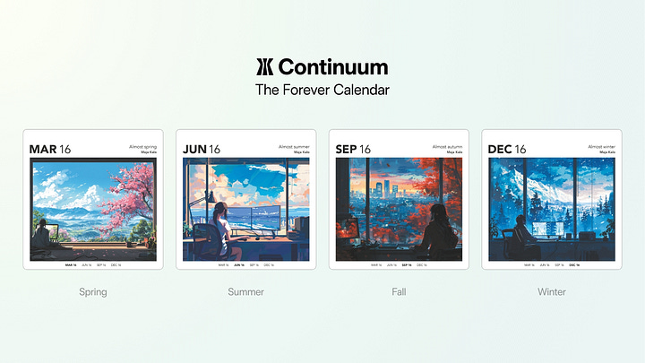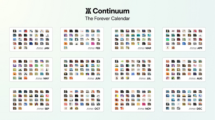 Continuum: The Forever Calendar is a perpetual daily calendar designed to be used year after year, featuring 366 unique works from 91 Gamma Partner Artists. Each artist contributed four pieces, spaced three months apart, creating a seasonal narrative that allows collectors to follow their journey through the year. The calendar showcases a diverse range of artistic styles, from photography and painting to generative and pixel art, with special attention given to holidays. This complimentary physical collectible will be available to all ticket holders at Inscribing Vegas on May 27, an event hosted by Inscribing Atlantis, Nolcha Shows, and Gamma, in partnership with The Bitcoin Conference. Additionally, a limited number will be raffled to Gamma Winter Pass holders, who only need to cover shipping and handling. Continuum is a celebration of the talented artists shaping the Bitcoin art space, and we can't wait for collectors to experience it firsthand.