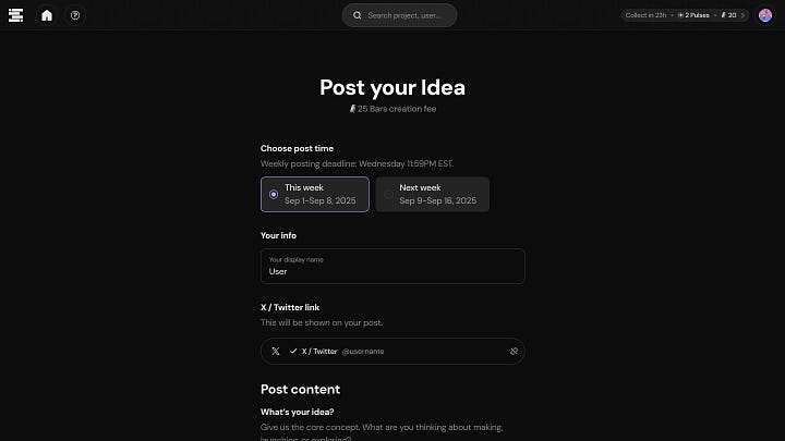 Anyone can post Idea. And when you’re ready, you can graduate your Top 5 Ideas of week into Project, bringing them to market. Posting Idea costs 25 Bars ($2.50), helping keep feed focused and limiting spam.