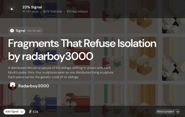 A year in the making... Fragments that Refuse Isolation - a generative networked sculpture on Bitcoin. Every piece nudges the rest. Every piece evolving as Bitcoin evolves. 64 editions, always connected.