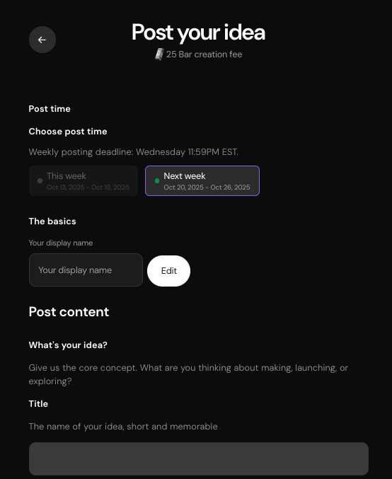 Anyone can post Idea. And when you’re ready, you can graduate your Top 5 Ideas of week into Project, bringing them to market. Posting Idea costs 25 Bars ($2.50), helping keep feed focused and limiting spam.