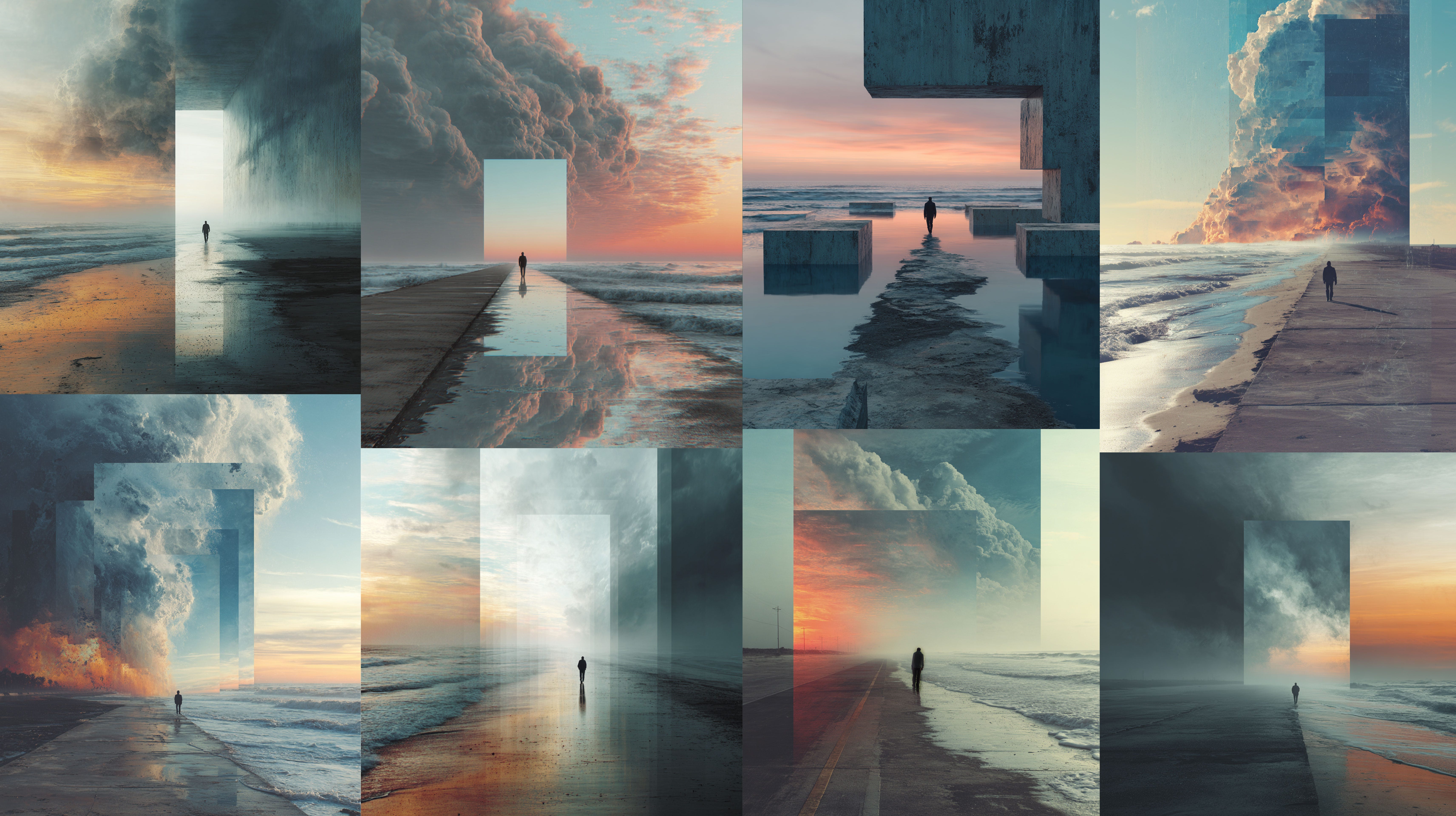 Stepping towards a new beginning A visual meditation on departure and becoming. Each piece frames the coastline as a living threshold — portals carved from sky, water, and memory, guiding a solitary figure toward an unseen tomorrow. This collection explores the quiet tranquility of being present, of yearning, exploring the way a single step can widen the world. An exploration between art styles, produced from a year of new beginnings and new technology, within multiple themes to communicate my current state of mind. Intended as a a small collection of 1/1s and low edition prints, the purpose behind New Horizons is to share my need for peace and calm amidst digital disruptions in an uncertain time.