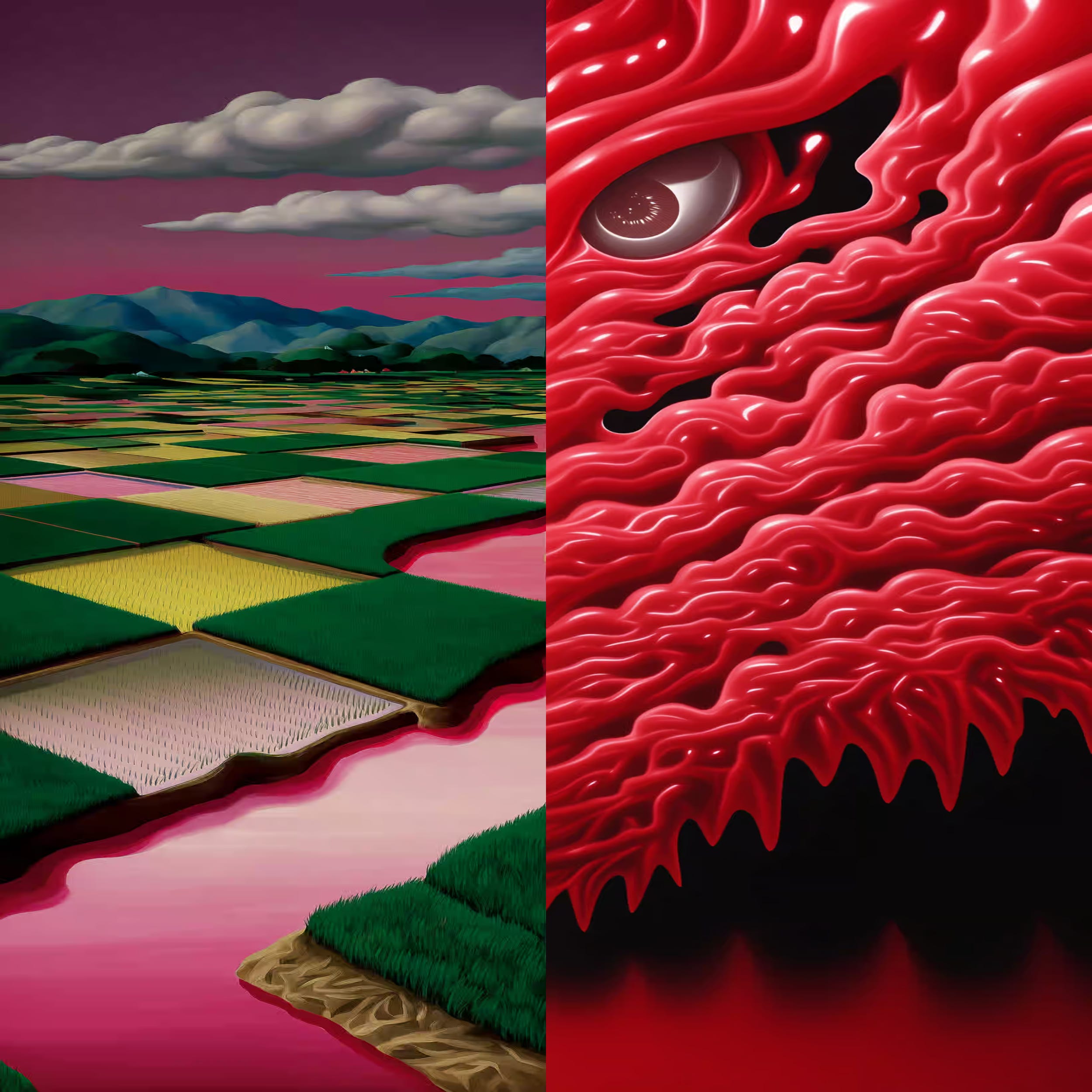 RedruM’s work blends surreal, symbolic worlds with dreamlike palettes punctured by vivid red, creating tension, emotional depth, and uncanny familiarity.