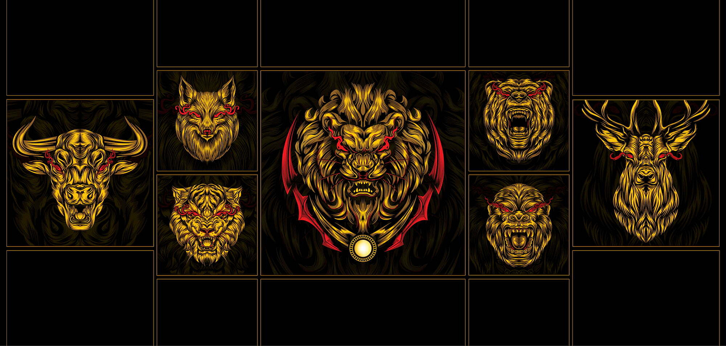 A limited 1/1 digital art series of wild animals as fiery, golden guardians, blending photomanipulation and illustration, inscribed early on Bitcoin Ordinals.